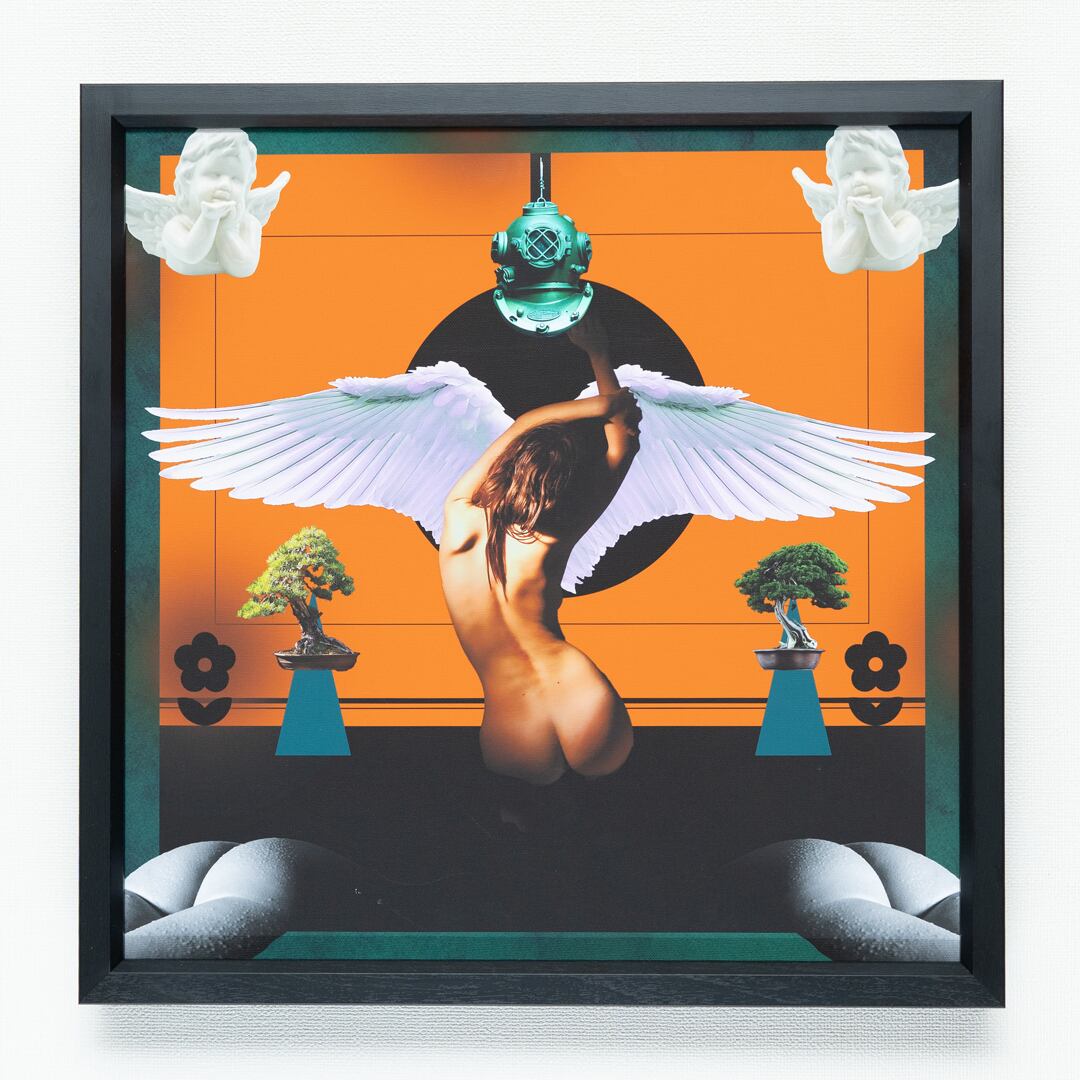 天使の翼を持ちながらも、古い潜水ヘルメットを抱える裸体の女性。その姿は「上昇」と「沈降」の間で揺れる存在として描かれている。神聖さと官能、軽さと重さ、自由と束縛の相反する象徴がコラージュによって同居している。両脇に配置された盆栽や、日本的な文様モチーフは「静」と「制御」を示し、西洋の天使像との文化的なコントラストを生む。